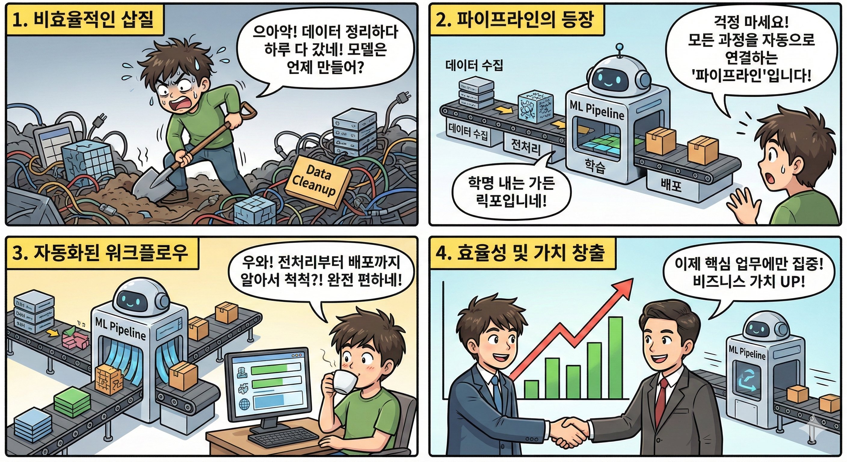 파이프라인을 통해 데이터 과학자는 모델 개발에 집중하고, 비즈니스 가치를 극대화하는 데 더욱 집중할 수 있습니다.