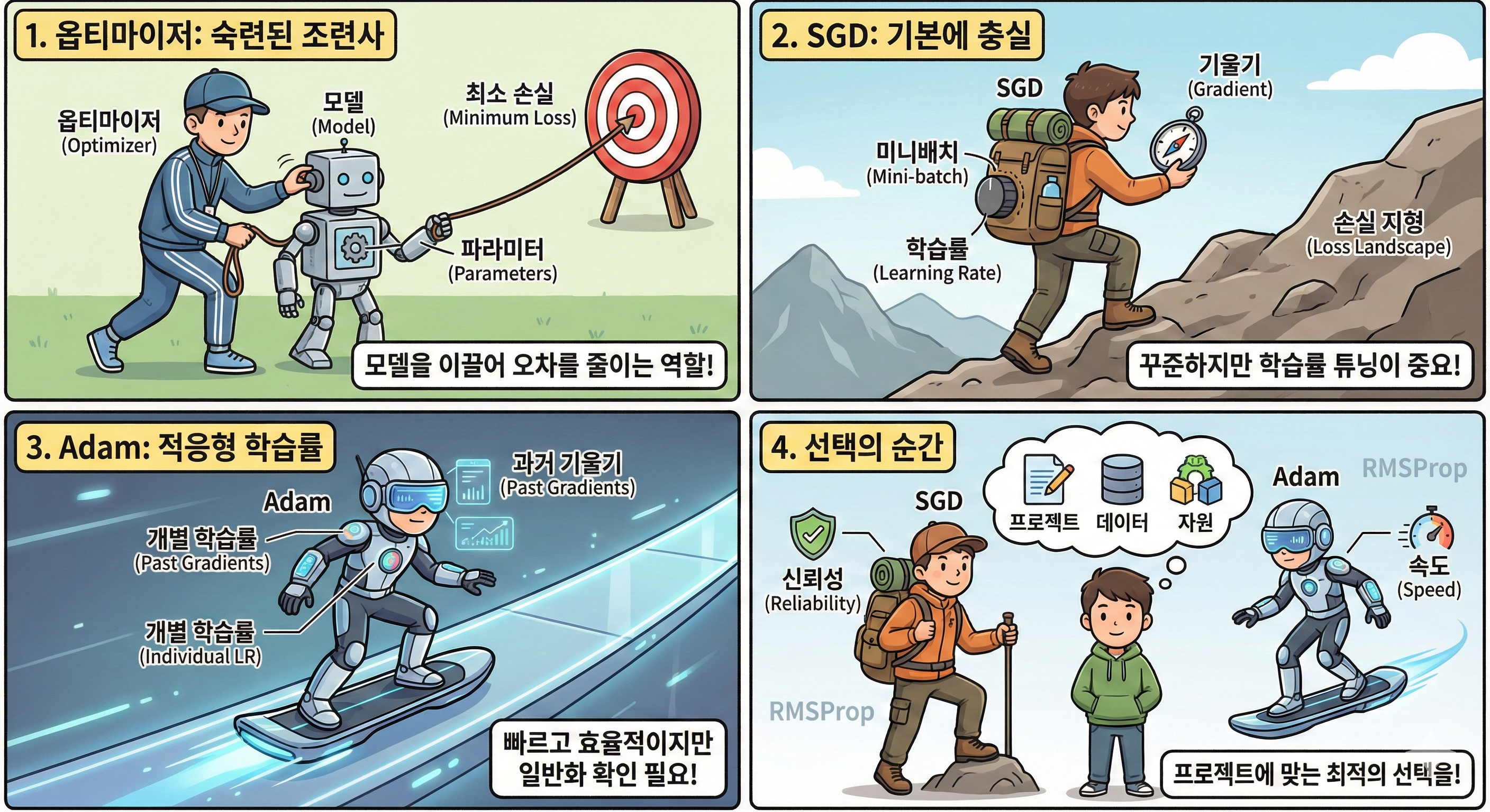 옵티마이저는 딥러닝 모델 학습 과정에서 마치 숙련된 조련사와 같습니다.