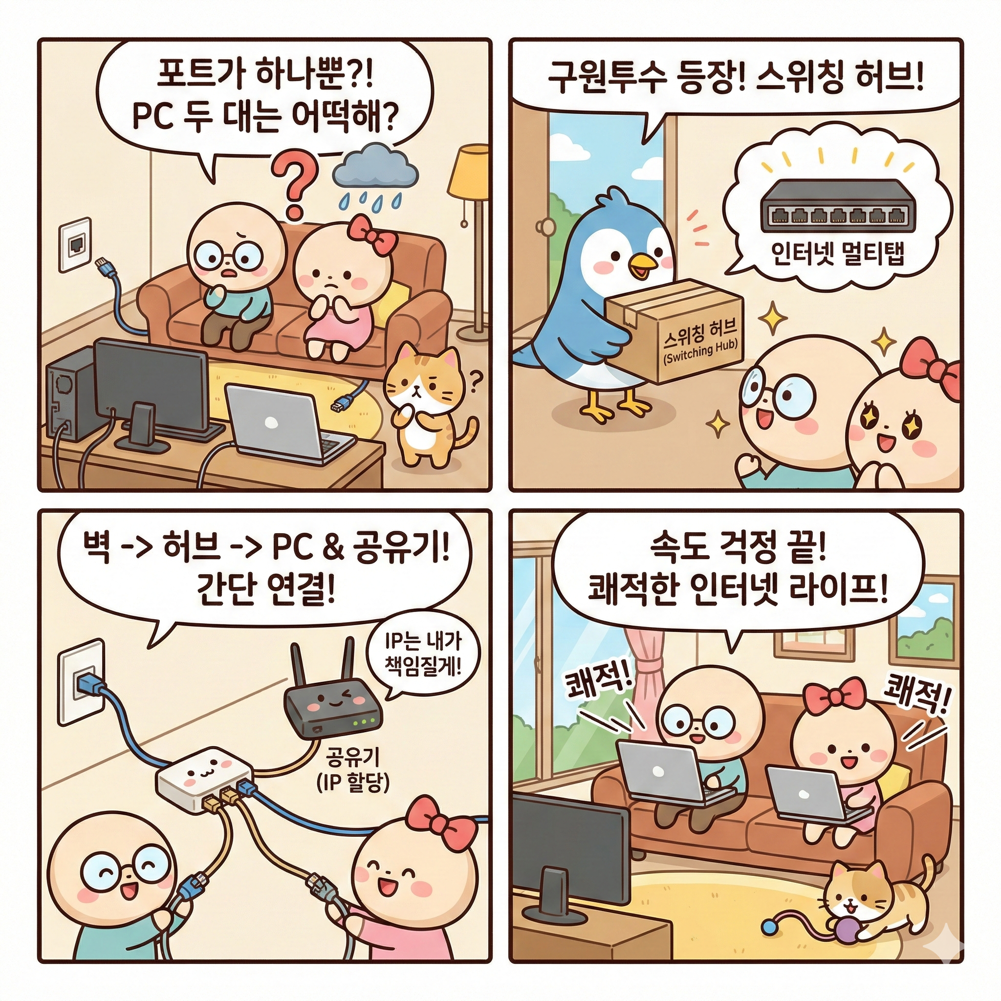 이 작은 장치는 마치 멀티탭처럼, 하나의 인터넷 회선을 여러 개의 기기로 나누어 사용할 수 있게 해줍니다.