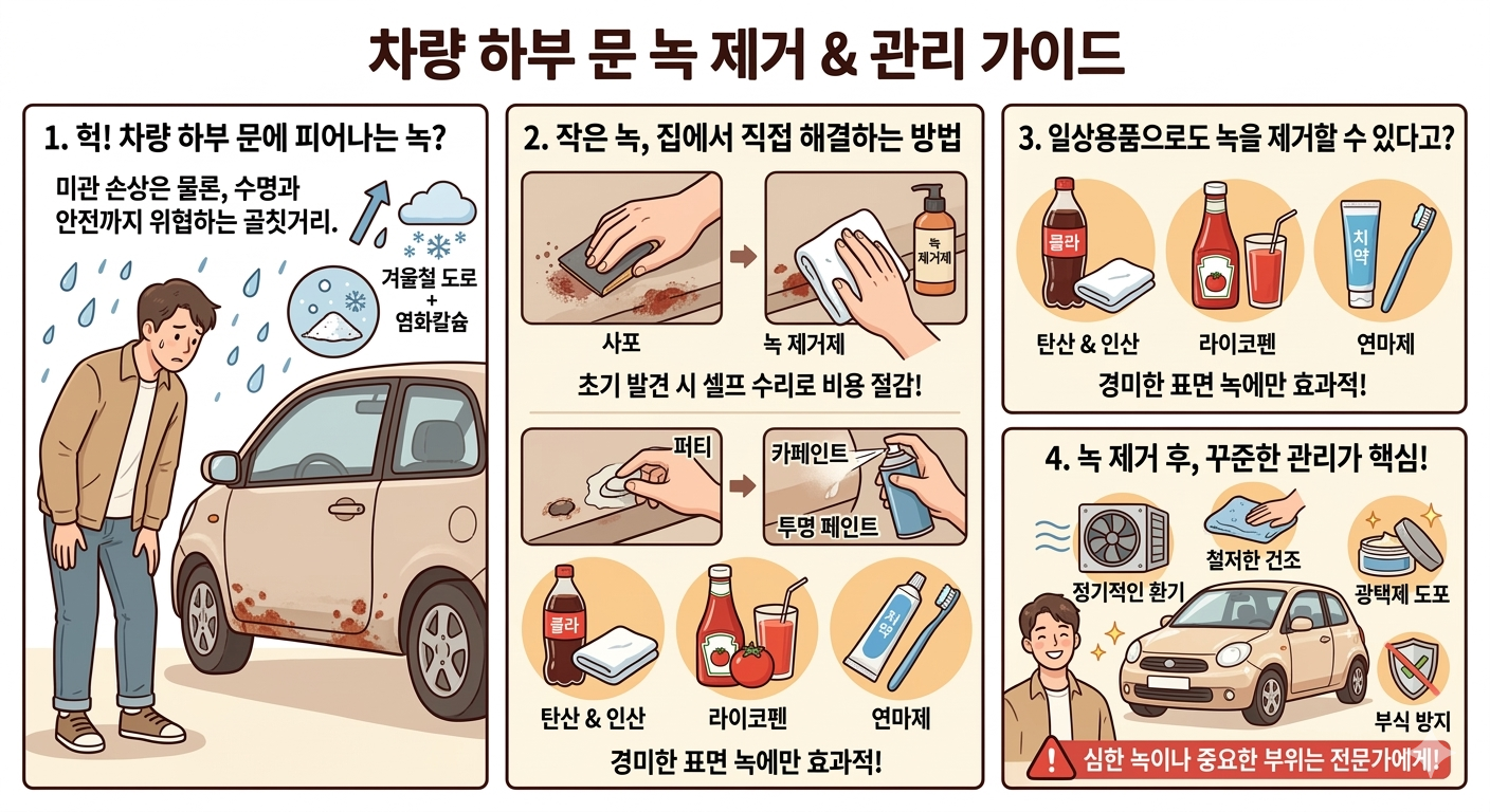 도로를 달리다 보면 차량 하부 문에 슬그머니 피어나는 녹은 단순히 미관을 해치는 것을 넘어, 차량의 수명과 안전까지 위협할 수 있는 골칫거리입니다.